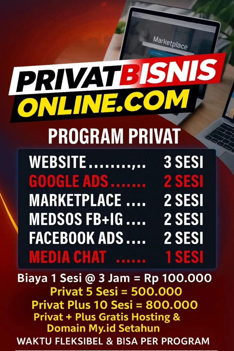 Privat Kursus Digital Marketing Jogja adalah tempat pelatihan terbaik dan terdekat di Yogyakarta bagi Anda yang ingin memulai atau mengembangkan bisnis online. Dengan metode belajar yang fleksibel dan mudah dipahami, Anda akan dibimbing secara langsung untuk menguasai strategi pemasaran digital seperti Google Ads, Meta Ads (Facebook & Instagram), pembuatan website SEO, serta teknik jualan di toko online dan marketplace. Cocok untuk pemula, UMKM, hingga pelaku usaha yang ingin meningkatkan penjualan dan menjangkau lebih banyak pelanggan secara online. Layanan Kami : Kursus Bisnis Online Kursus internet Marketing Kursus Pembuatan Website Kursus Jualan Online di Facebook Instagram Kursus Jualan di Marketplace Shopee Kursus Google Ads Meta Ads”